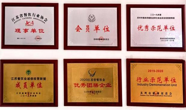荣获多项荣誉和认证,如“食品安全示范单位”“全国绿色餐饮企业”“苏州健康团膳企业”“最受欢迎大众化餐饮企业”“餐饮行业示范单位”等,彰显企业实力。