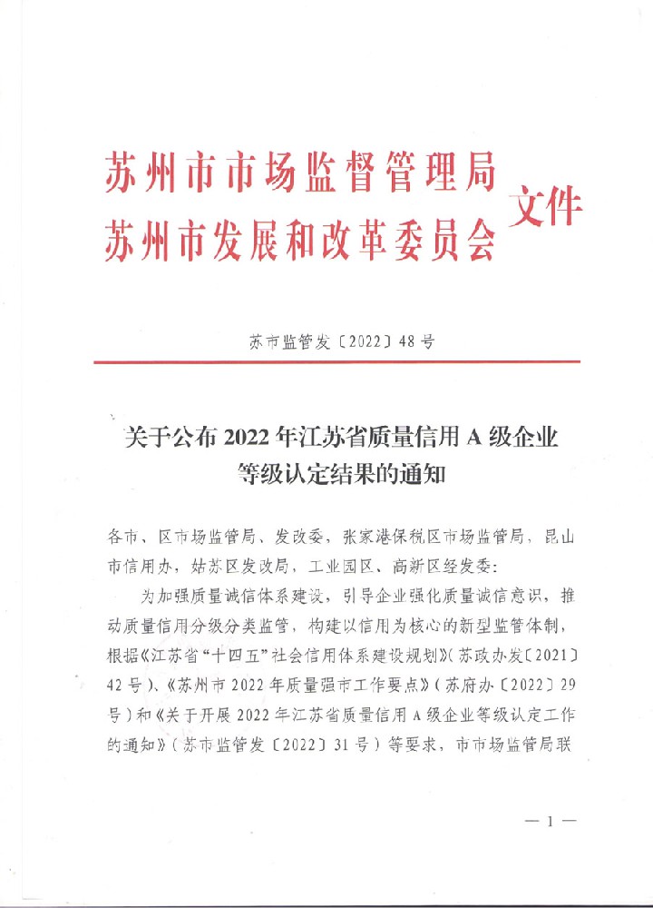 2022年江苏省质量信用A级企业等级认定结果的通知